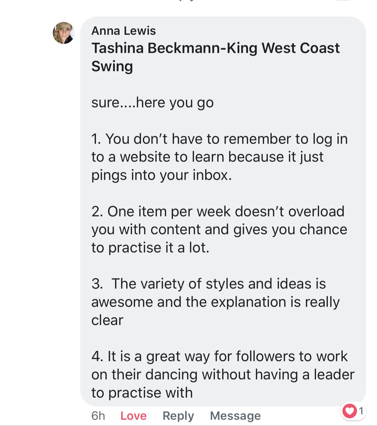 But it was Tashina’s program that propelled me out of the doubts and fears that were holding me back into an understanding of what was important to me about dancing, and how dancing related to my values.